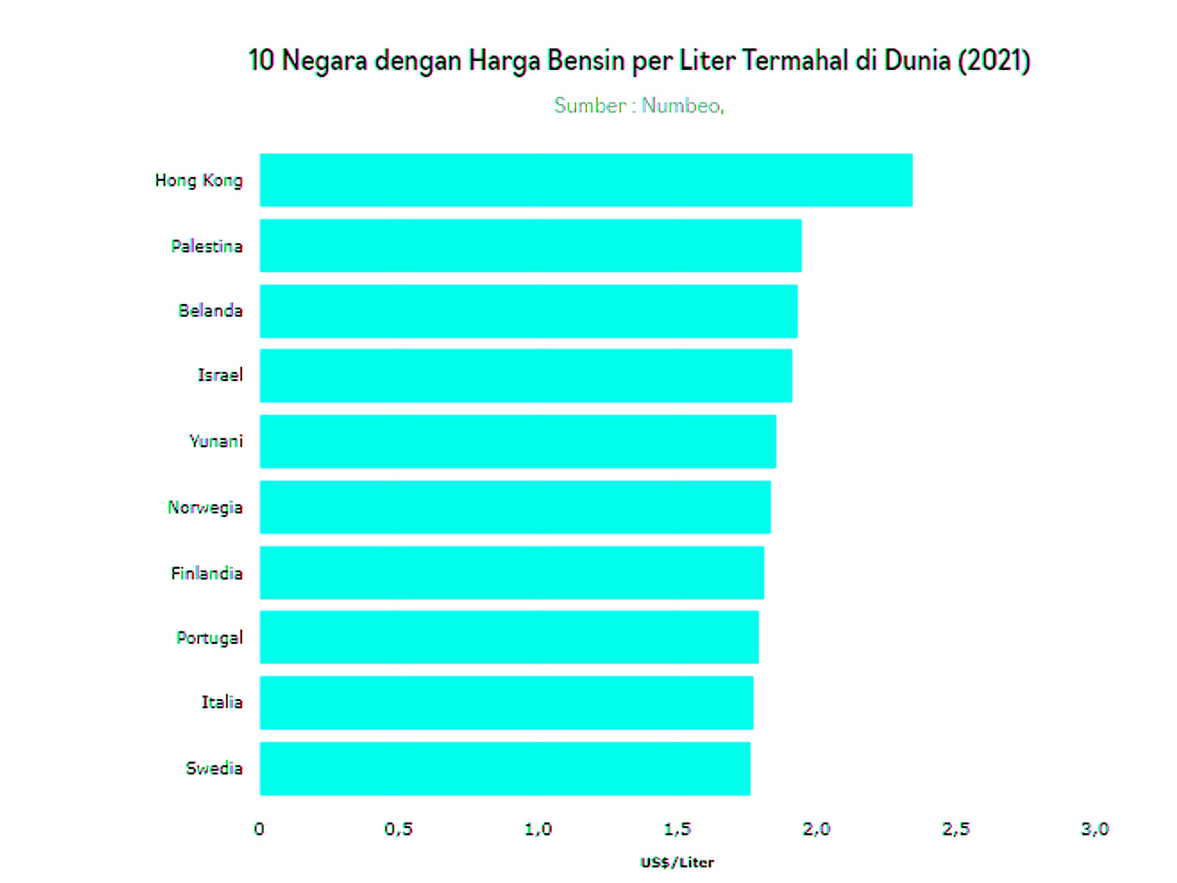 Sedangkan posisi Uni Emirat Arab berada di bawah Indonesia dengan harga bensin sebesar US$ 0,6 per liter atau sekitar Rp8.735 per liter. Sementara yang termahal ada di Hong Kong dengan harga US$ 2,34 per liter atau Rp 33.509 per liter (kurs Rp 14.320/US$)